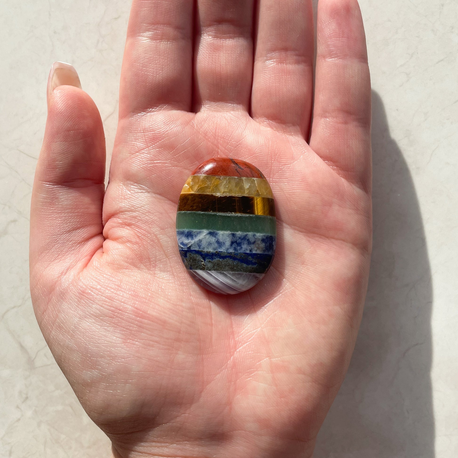 We are so happy to bring you our chakra worry palm stone with a small slice of each of the crystals that come together to give you balance for your body, mind and spirit across all of your chakras.