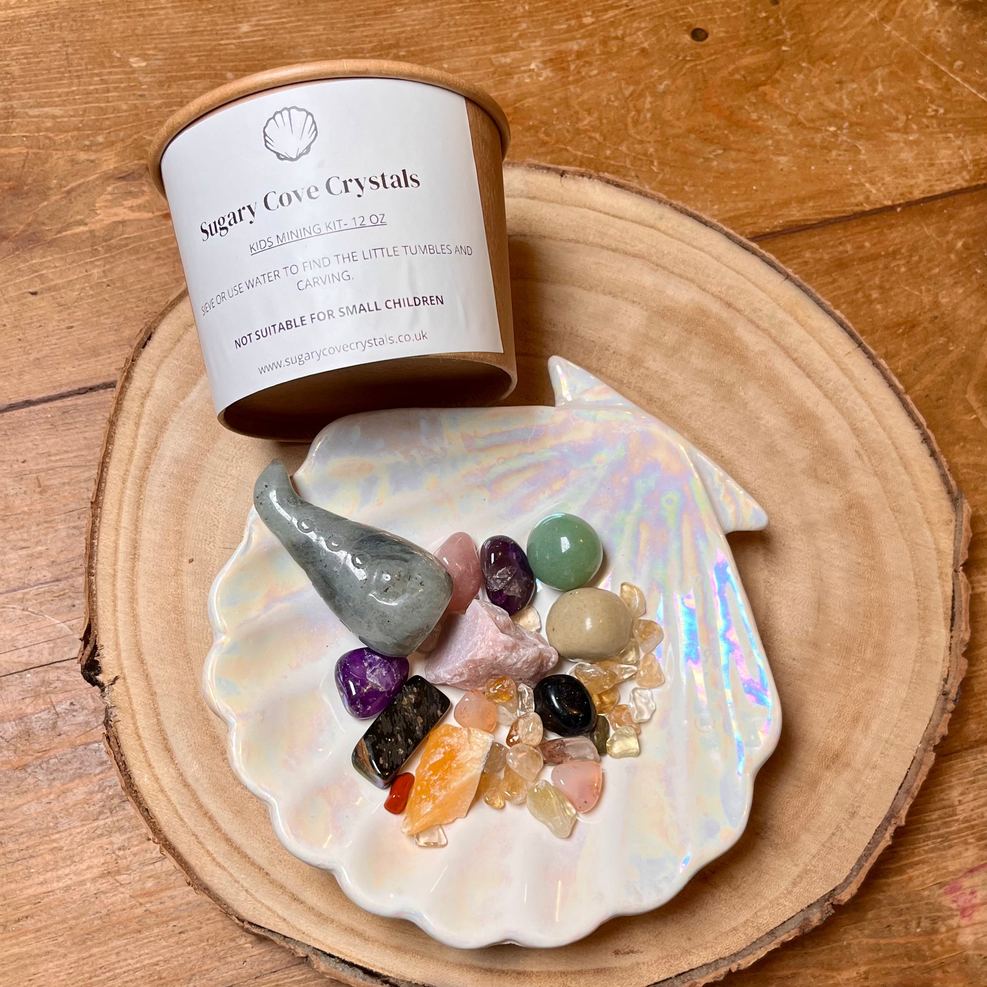 Our handmade Crystal mining pots are a fun and educational activity for adults and older children. Each pot contains a selection of real tumbled crystal gemstones, small stone crystal chips, and a significant character carving (3-7cm in size) some contain rough raw crystals all buried in child-friendly sand. The pots excavation kits allows you to dig and uncover the hidden treasures.