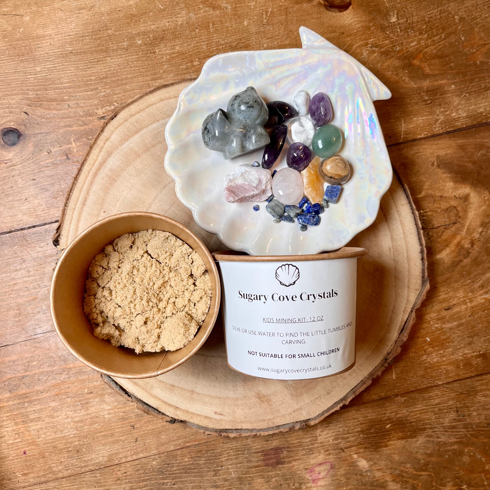 Our handmade Crystal mining pots are a fun and educational activity for adults and older children. Each pot contains a selection of real tumbled crystal gemstones, small stone crystal chips, and a significant character carving (4-7cm in size) some contain rough raw crystals all buried in child-friendly sand. The pots excavation kits allows you to dig and uncover the hidden treasures.