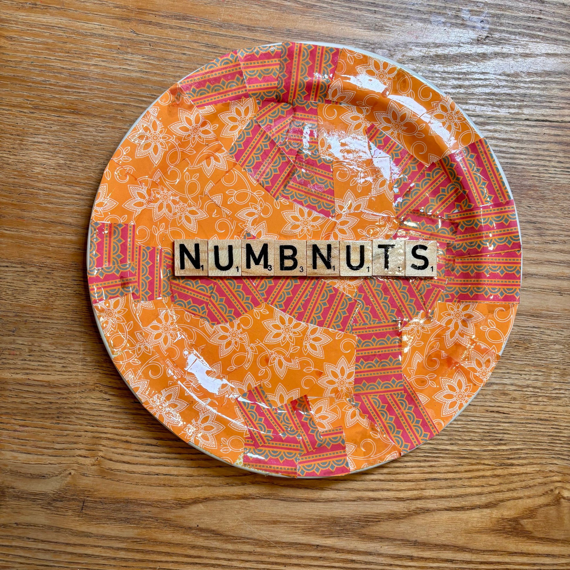 A beautiful decoupage plate made with orange and red paper, an old plate with paper and scrabble letters painted with varnish. 23 cm width. Display only.