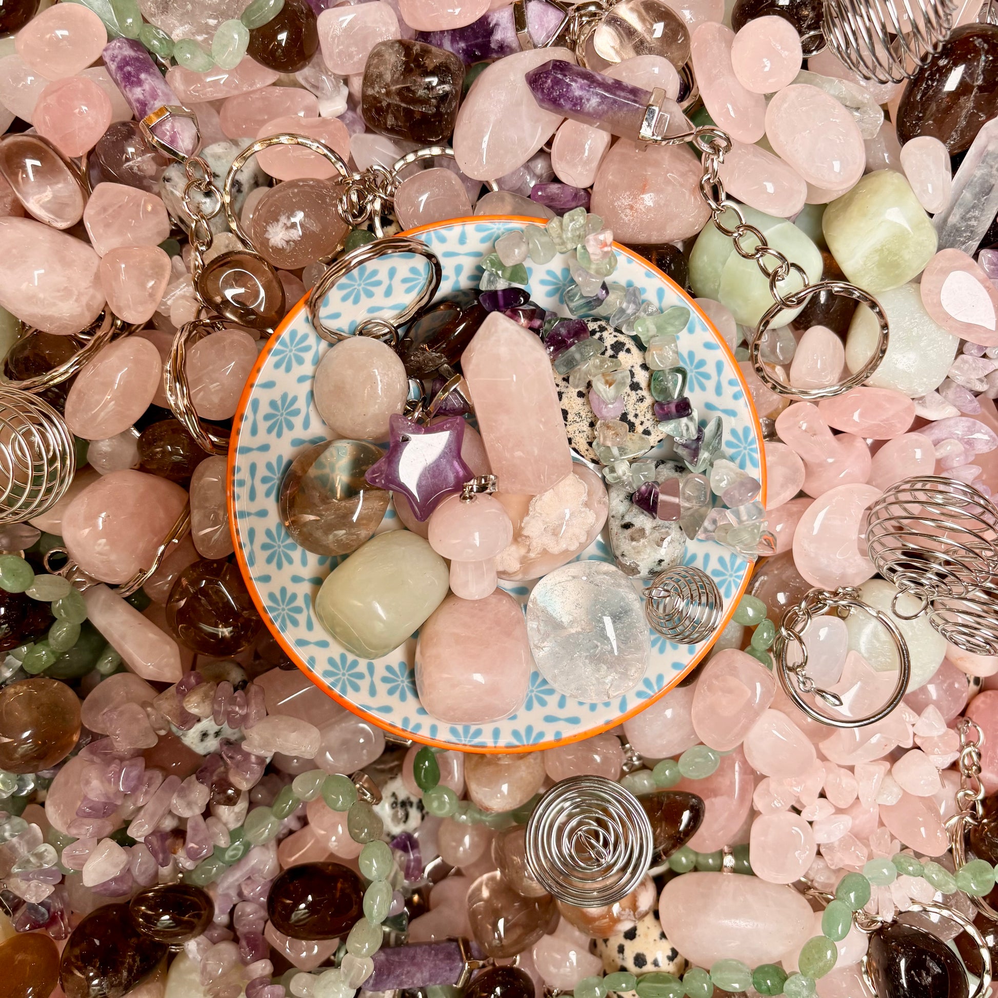 Your scoop may contain: Smokey Quartz, Green Aventurine, Lepidolite, Lavender Rose Quartz, Amethyst, Rose Quartz, Jade, Clear Quartz, Flower Agate, Dalmation Jasper, Fluorite, & Kiwi Jasper Crystals.